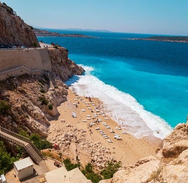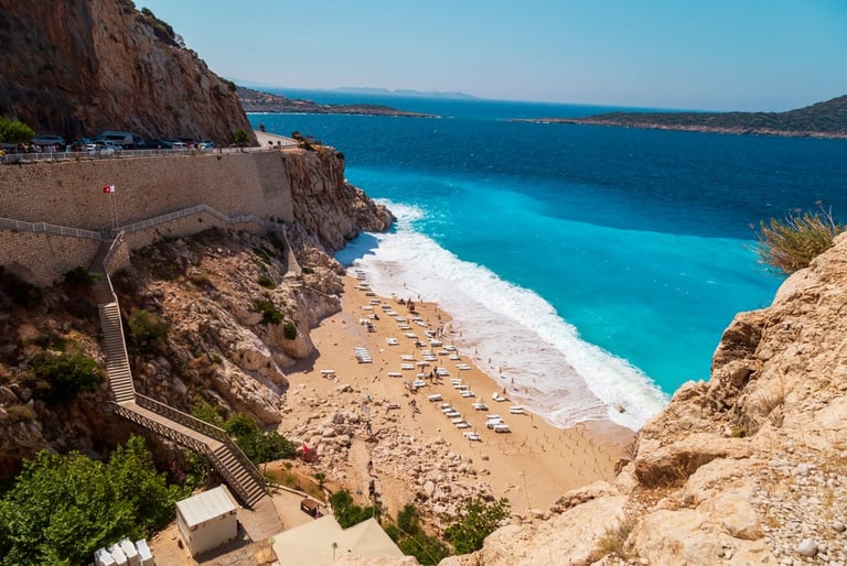 Türkiye’nin en güzel plajları olan Kaputaş ve Patara’ya da buradan kolaylıkla ulaşabilirsiniz. Patara, yaklaşık 20 dakikalık mesafede ve 17 km boyunca uzanan harika bir kumsaldır. Kaputaş ise yaklaşık 15 dakikalık sürüş mesafesinde küçük ama etkileyici bir kumsaldır. Kalkan’ın kendi küçük çakıl plajı da limanın hemen yanındadır.